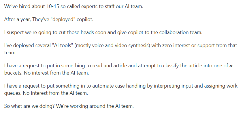 This problem-first approach matters because the alternative creates dysfunction. Redditors in enterprise IT roles describe watching dedicated AI teams fail to deliver on practical use cases: