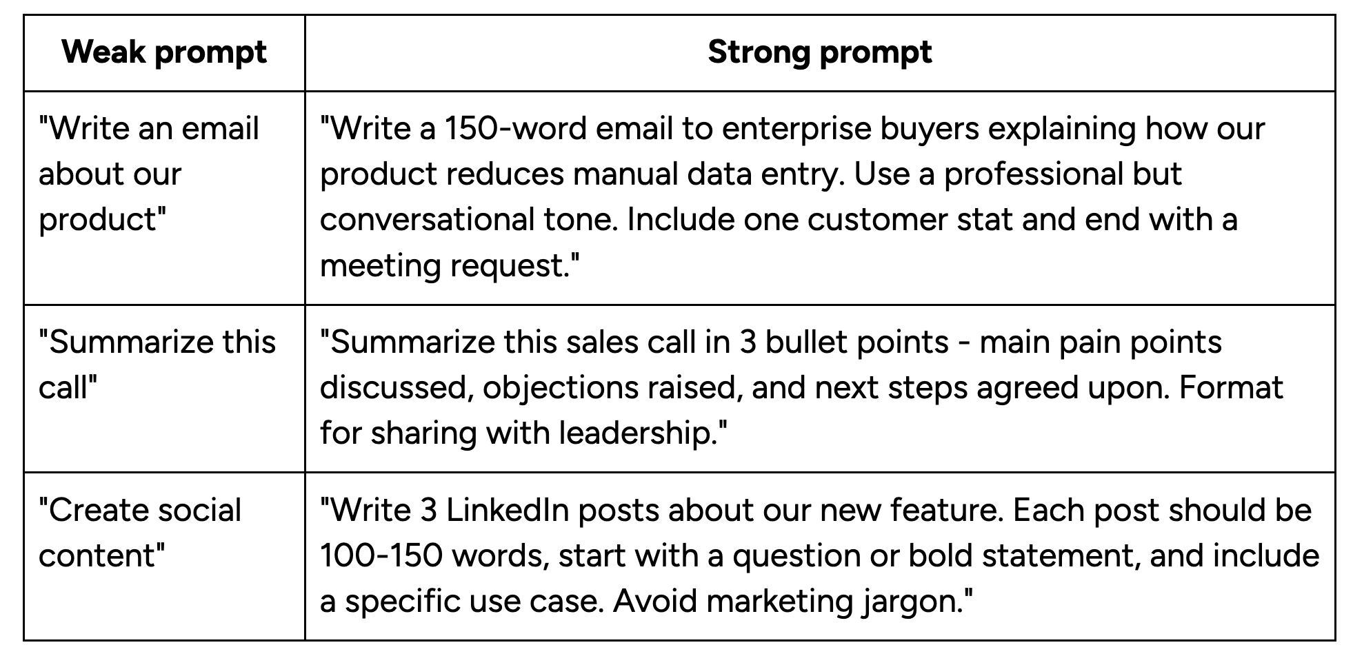 Even with perfect data, AI initiatives need clear instructions. Specific prompts that include context and constraints get you outputs that match your standards.