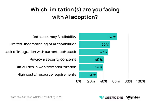 Teams don't yet trust AI for high-stakes work. As one Global Director of Sales Enablement (501-1000 employees, SaaS/software) put it: