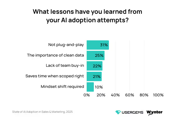 Based on our research, most teams find AI adoption messier than they anticipated. You need reliable data, specific problems to solve, and tools that support your team’s specific workflows.