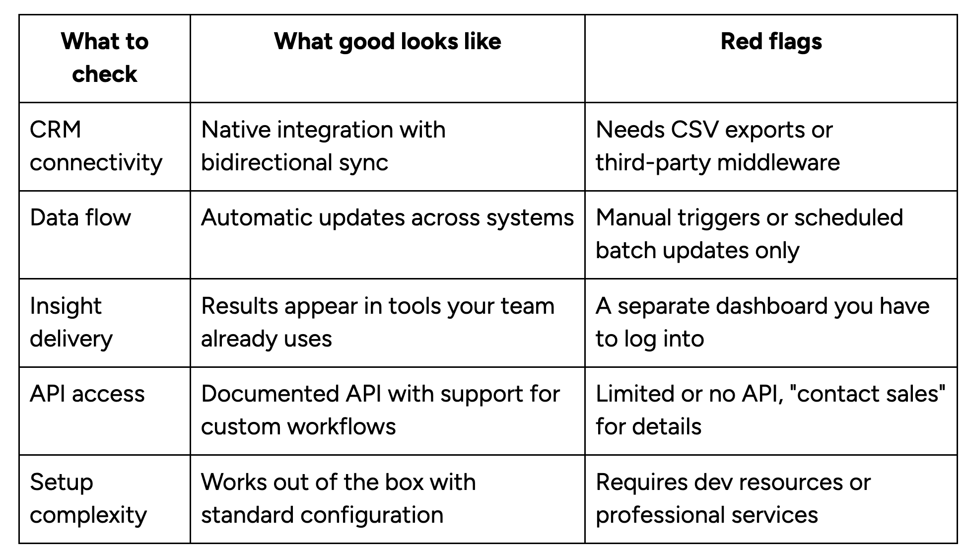 Before you commit to any AI tool, verify how well it connects to your existing systems. Here's what to evaluate specifically: