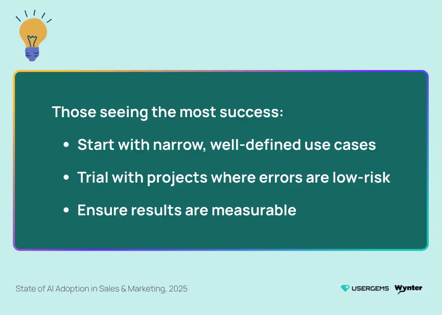 - Define success metrics before you evaluate any tools (conversion rates, time saved, pipeline generated)