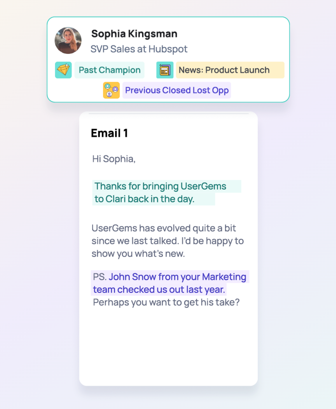 Signal-driven vs. cold outreach: Most AI SDRs start with cold prospecting—scraping databases to find anyone who might fit your ICP. UserGems starts with warm signals: past champions changing jobs, new hires at target accounts, or closed-lost opportunities showing fresh intent. We believe the best outbound starts with knowing who's actually in market. Gem-E triggers outreach based on specific high-value events—like a past champion changing jobs, a target account hiring a new executive, or a closed-lost opportunity showing new intent. This ensures your AI prioritizes warm paths over cold prospecting.