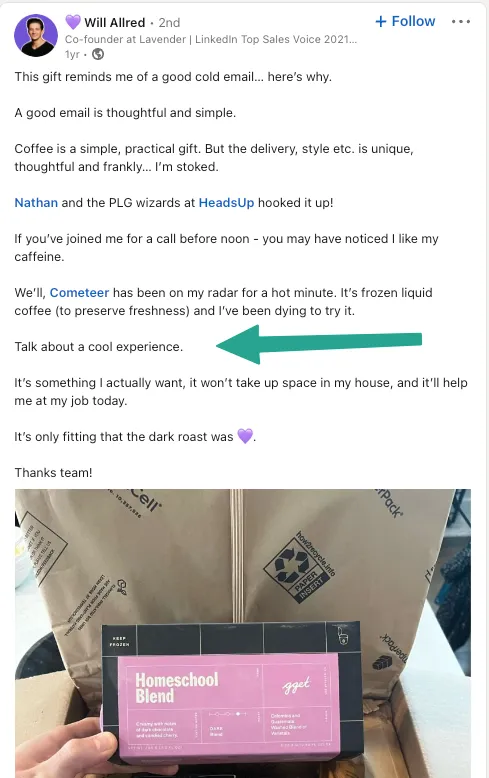 To understand what we mean, check out this post by Will Alfred, LinkedIn Top Sales Voice 2021. The PLG team at HeadsUp, an AI-based conversion tool, gifted Will coffee from a brand he was eager to try. The gesture worked because it showed the company had done research on what he actually wanted.