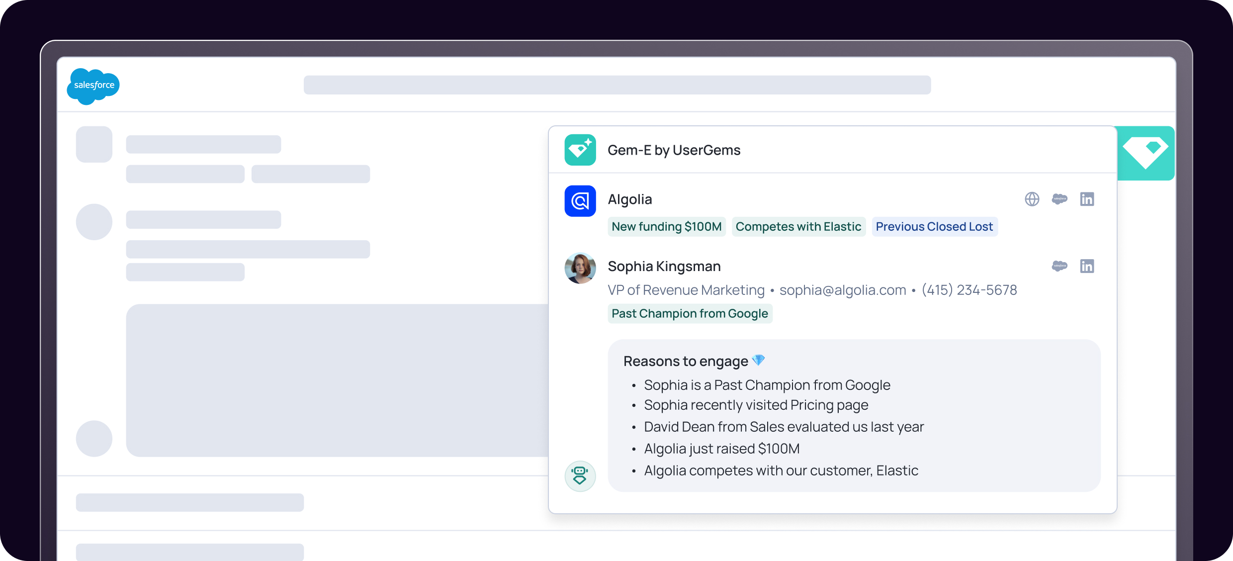 UserGems surfaces companies and buyers who are showing buying signals, then tells your sales and marketing teams who’s in-market now and what to do next.