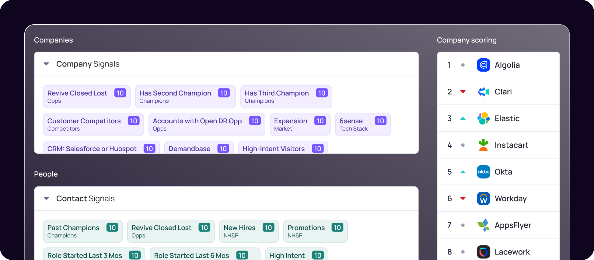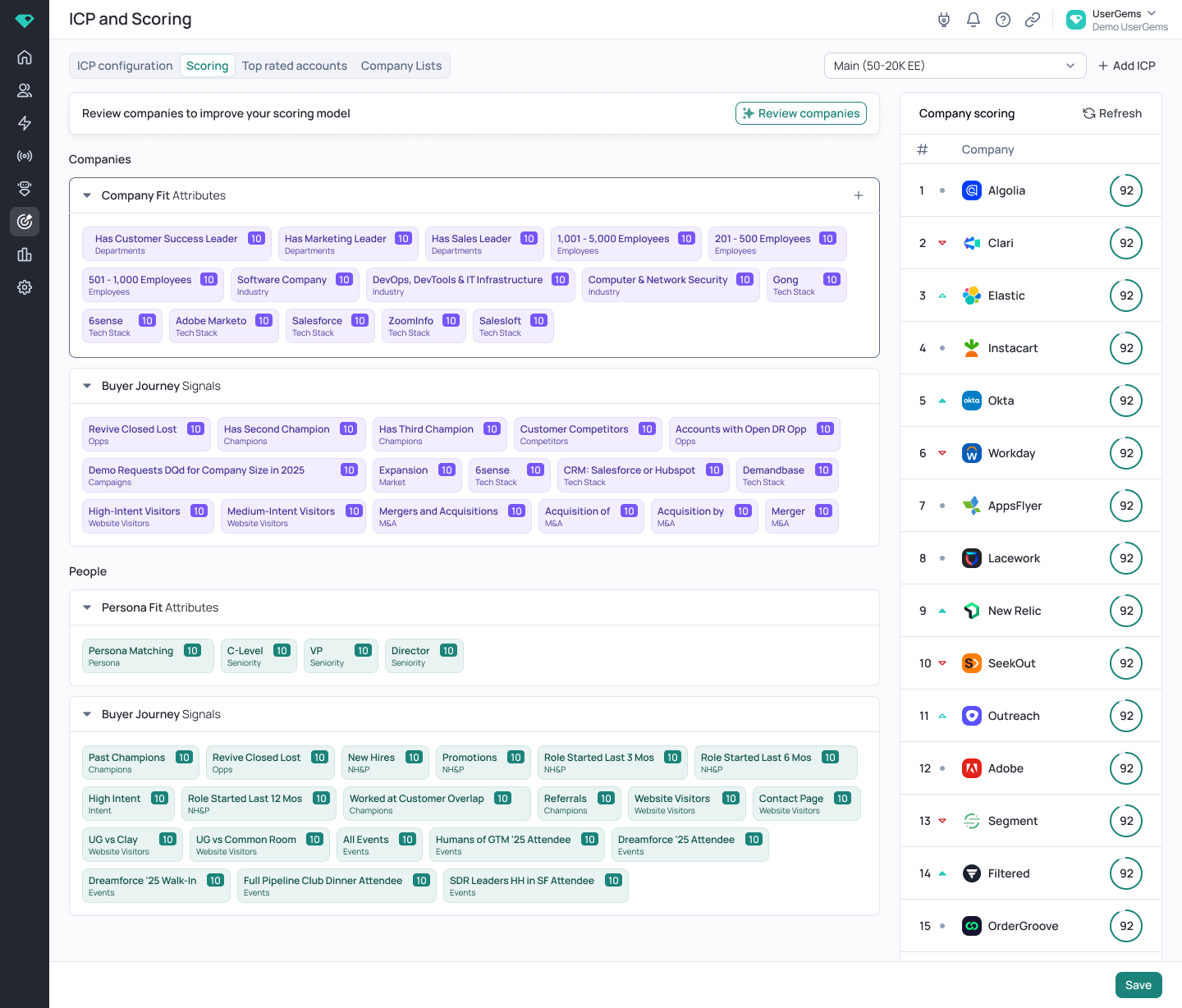By analyzing opportunities, customers, and deal outcomes, UserGems evaluates 600+ ICP criteria and signals to continuously prioritize accounts and contacts most likely to convert. Scoring models are transparent and fully customizable, giving teams direct control over how targeting decisions are made.