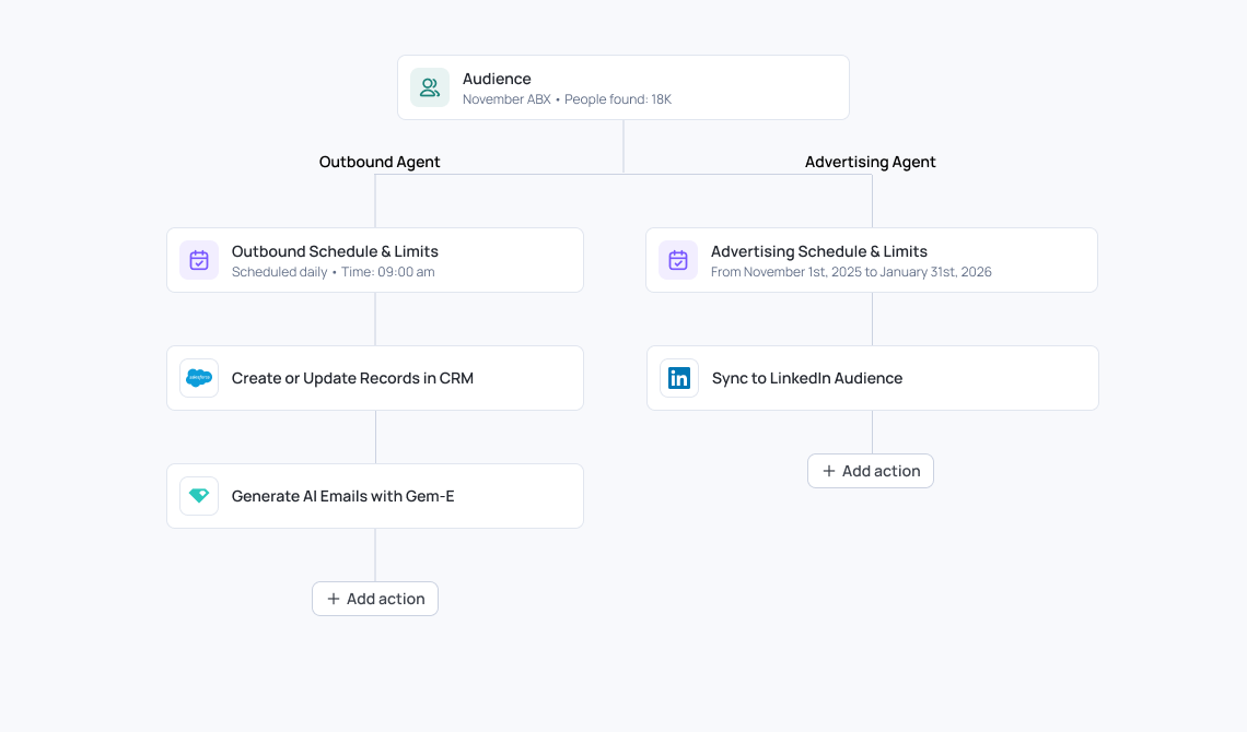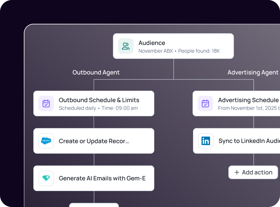 Target buyers with the right message, at the right buying stage, across outbound, ads, alerts, and CRM updates - all coordinated through a single system rather than disconnected tools (and many meetings).