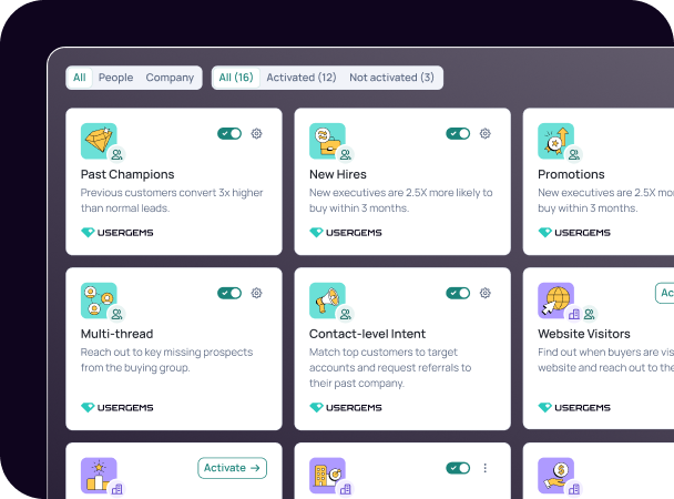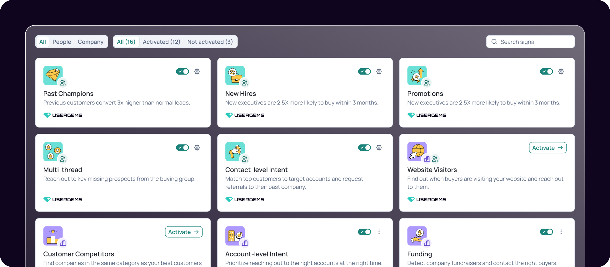 UserGems comes with 21+ native signals - from buyer intent, website visits, role changes, to M&A, 10K filing, hiring, and more. It also unifies your existing data - closed lost opportunities, calls, marketing engagement, product usage, and any other intent providers.