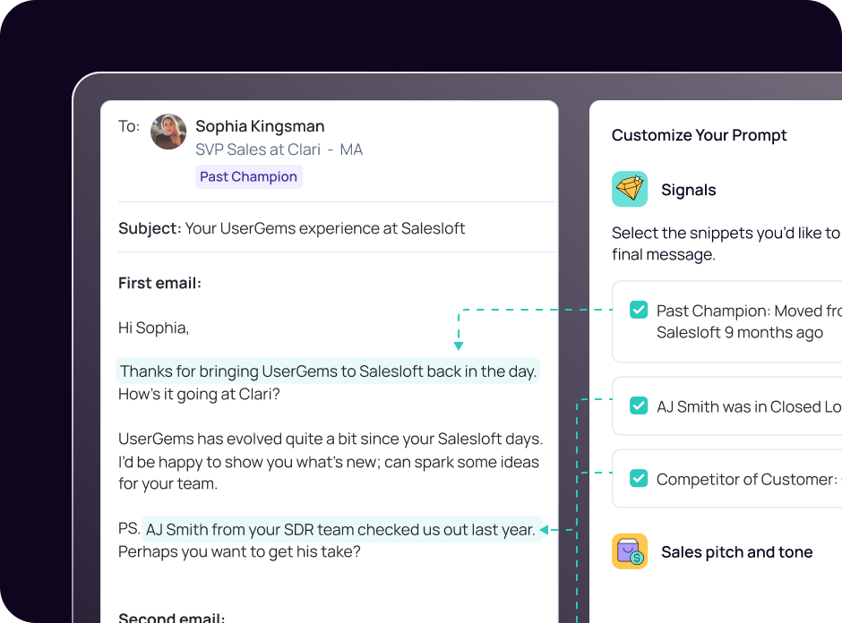 AI analyzes call transcripts and CRM data from past closed-lost deals to surface relevant context for sellers. Reps get clear insights and personalized outreach to re-engage buyers without manual research.