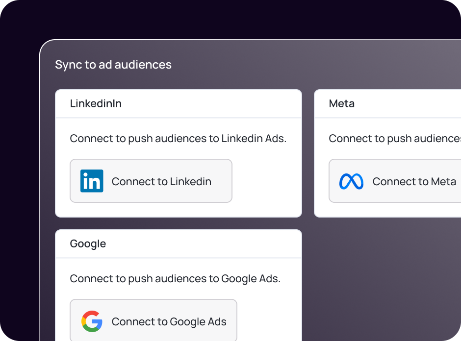 Ad activation tied to contact-based audiences, signals, or buying stages. High-intent contacts are automatically synced to LinkedIn, Google, and Meta.